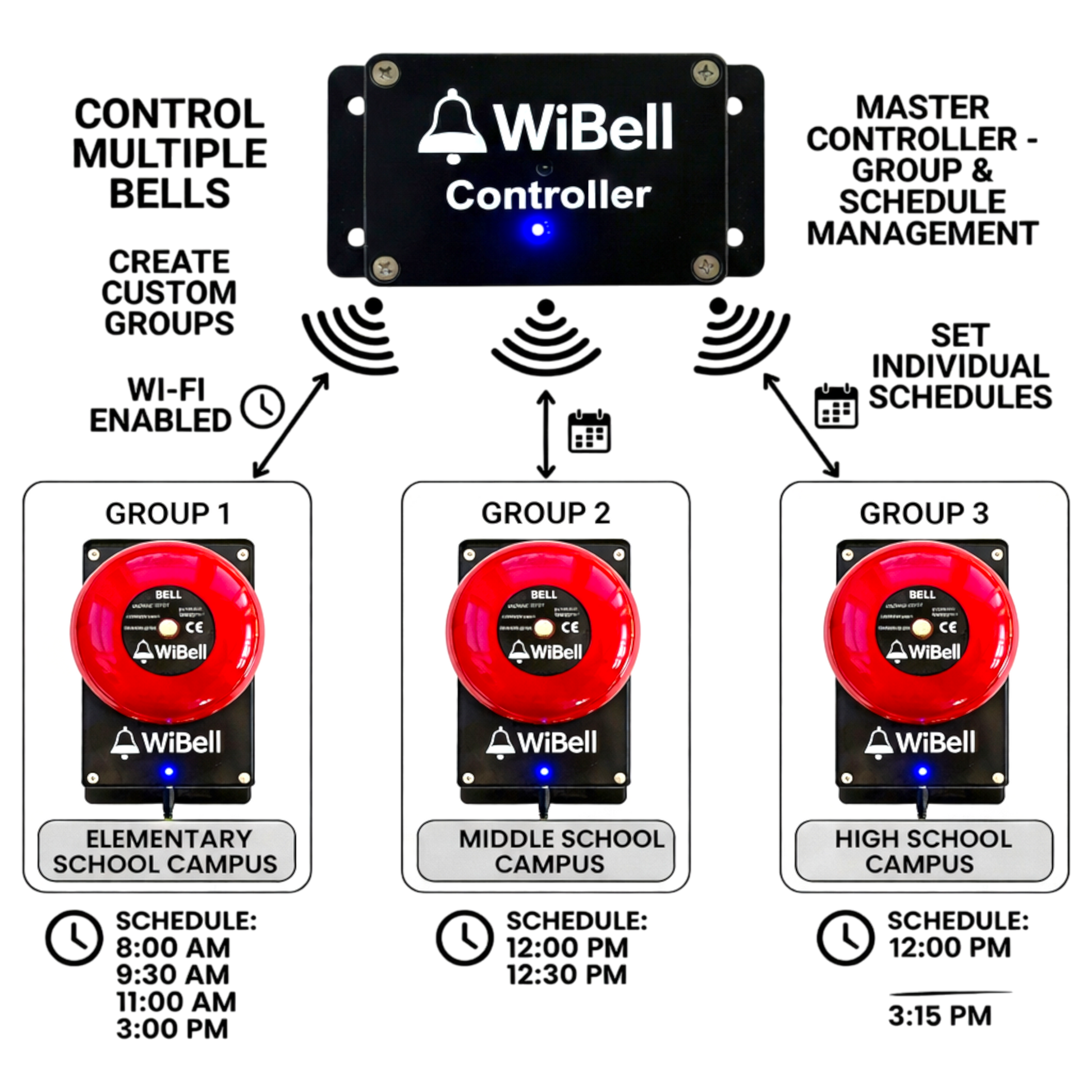 WiBell systems are used for class schedules, shift changes, and timed alerts where reliability matters. All configuration runs locally with no cloud dependency.